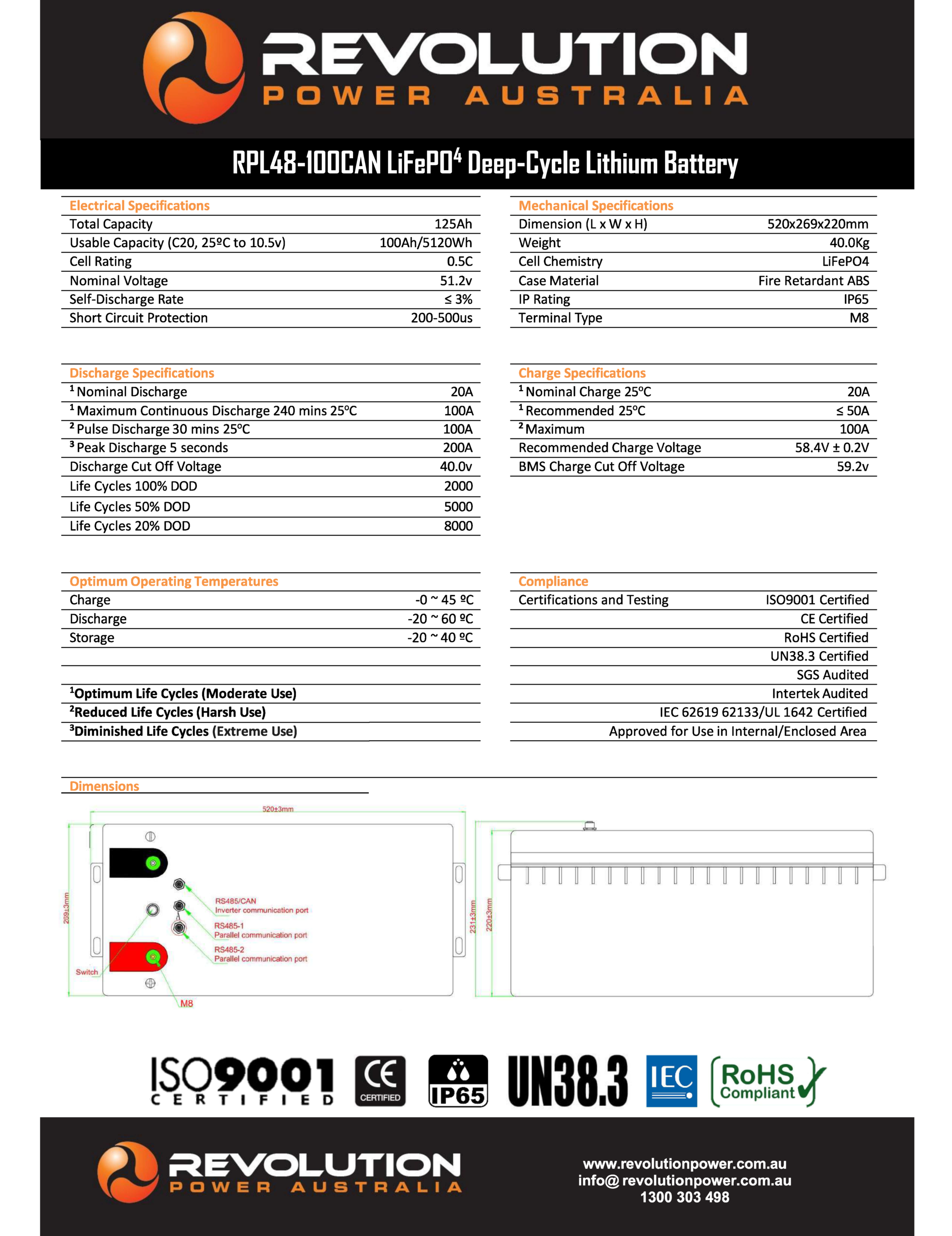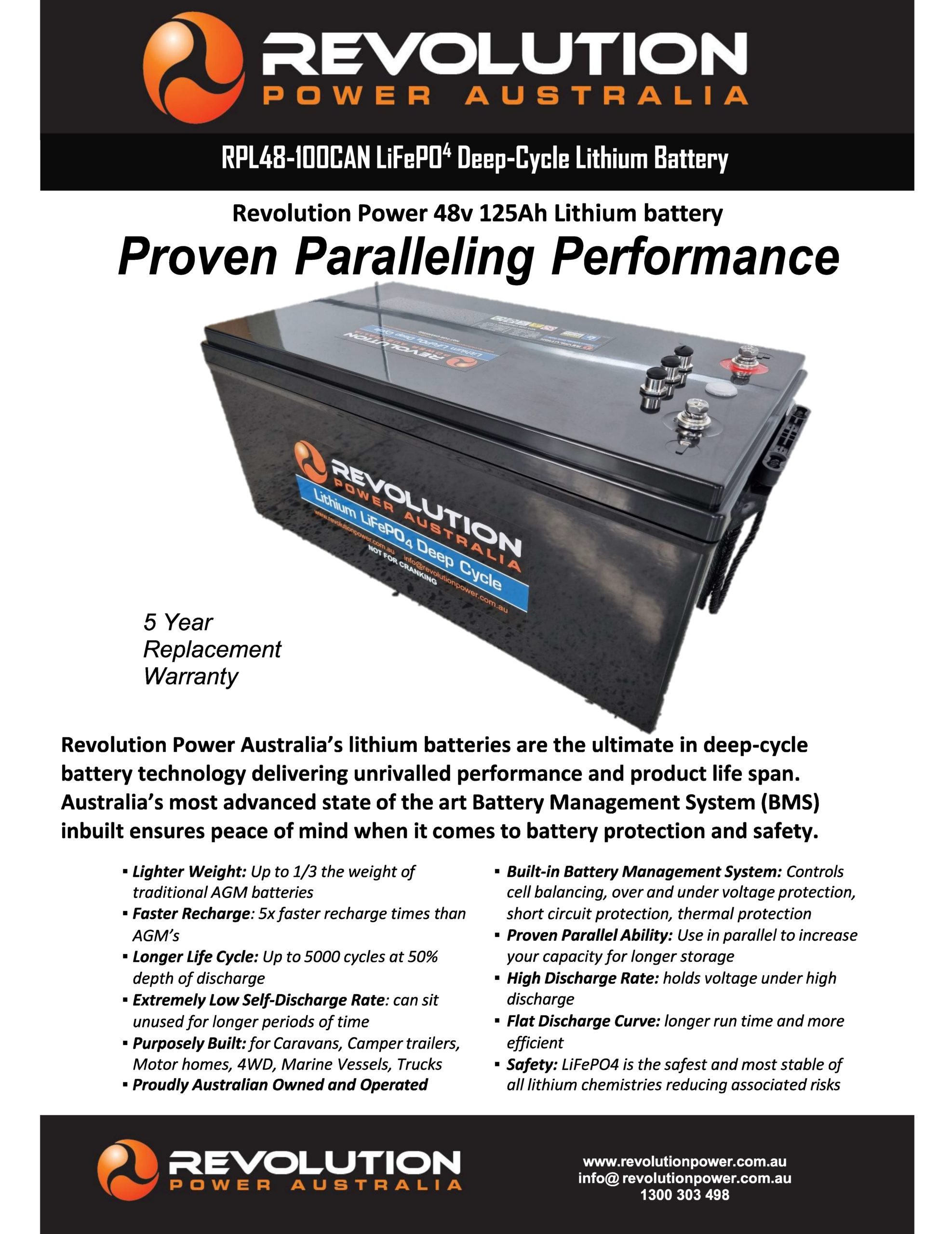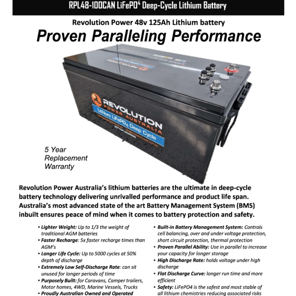 The Revolution Power Australia 48Volt 100Ah lithium battery has been developed for use in off-grid marine, truck, and RV applications. For its size and weight, it packs a huge punch. When connected in parallel these high power batteries are up for the challenge, delivering a constant voltage and fast recharge.